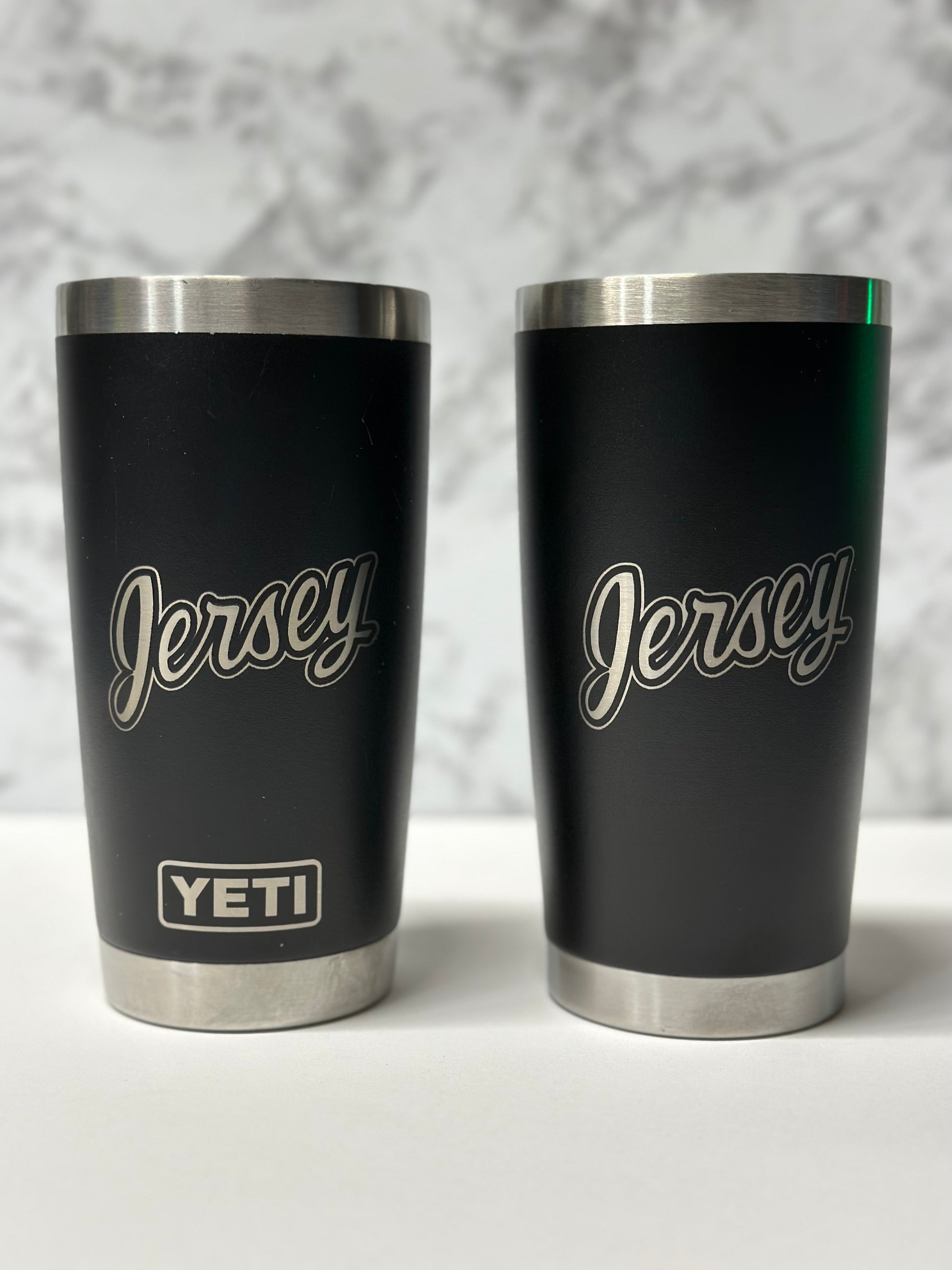 Custom engraved Yeti Tumbler with "Jersey" laser engraved to show off the love of the only true Jersey Team!!